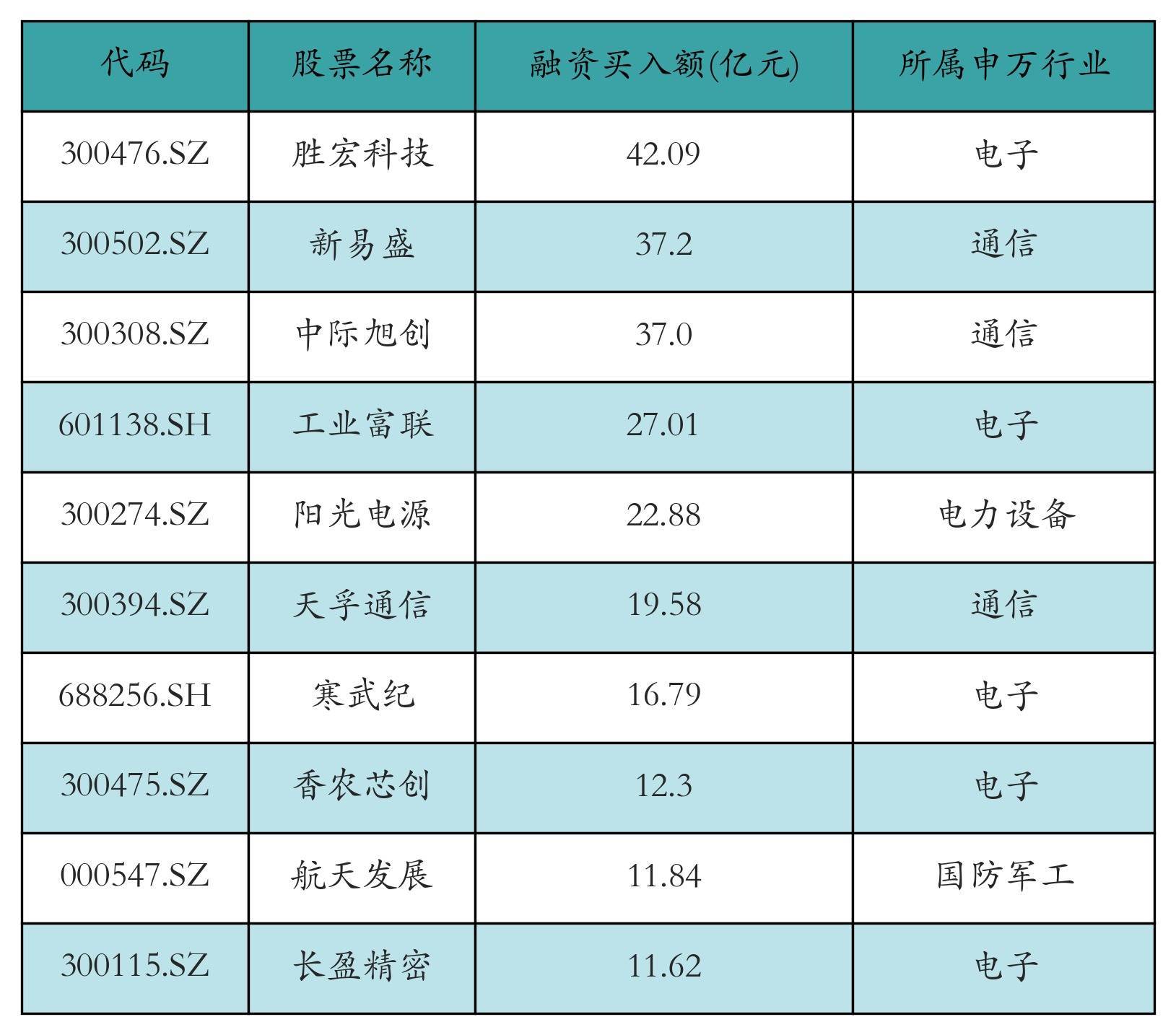 两市共有3461只个股有融资资金买入,其中胜宏科技、新易盛、中际旭创排行前三,买入金额差别42.09亿元、37.2亿元、37.0亿元。融资买入额前10个股确定见下表: