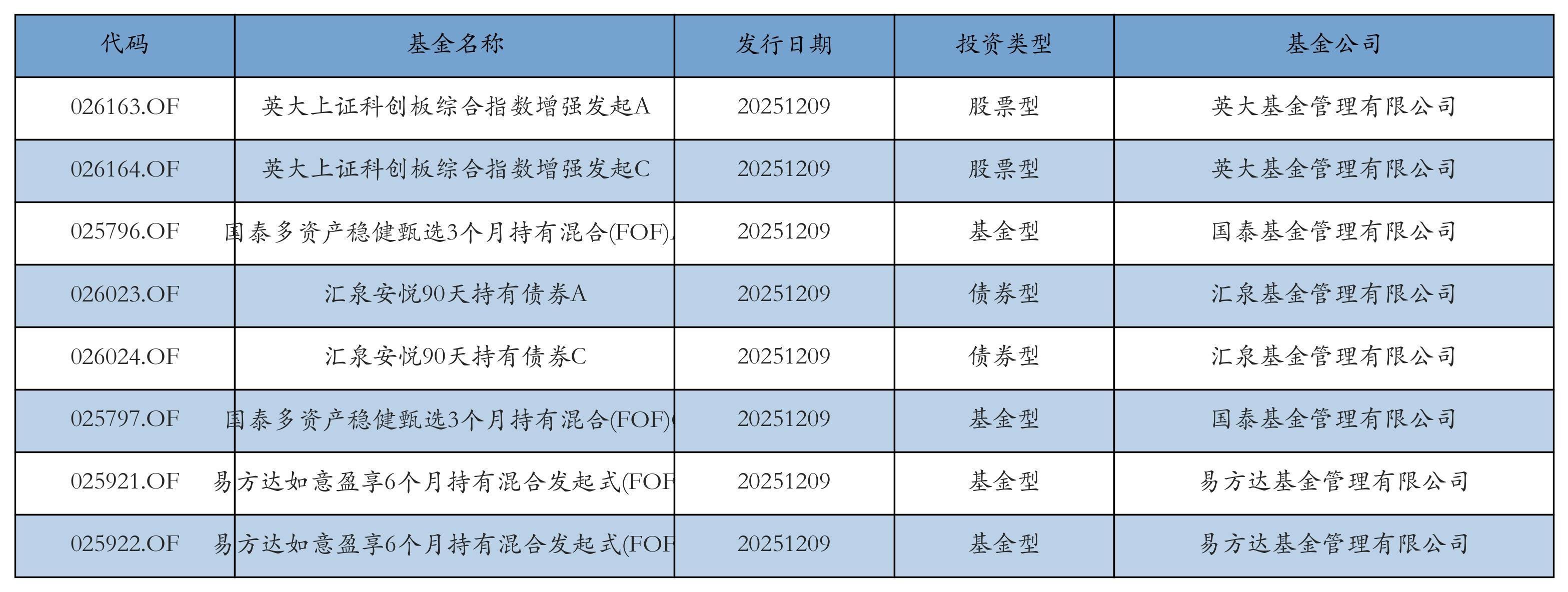 昨日有8只新基金刊行,差别为:英大上证科创板玄虚指数增强发起A、英大上证科创板玄虚指数增强发起C、国泰多财富持重甄选3个月握有搀杂(FOF)A、汇泉安悦90天握有债券A、汇泉安悦90天握有债券C、国泰多财富持重甄选3个月握有搀杂(FOF)C、易方达如意盈享6个月握有搀杂发起式(FOF)A、易方达如意盈享6个月握有搀杂发起式(FOF)C,确定见下表: